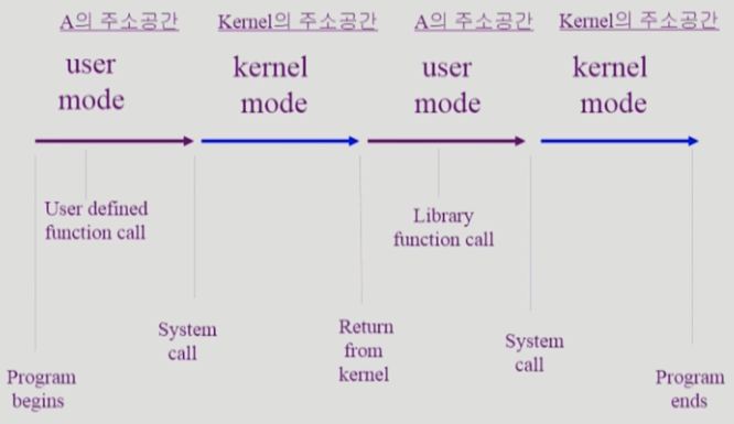 프로그램 시작 -> 유저모드와 커널모드를 반복하며 실행 -> 프로그램이 끝