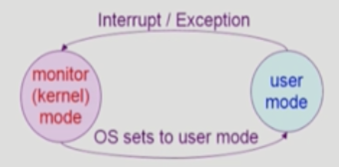 Interrupt나 exception 발생시 하드웨어가 mode bit을 0으로 바꿈